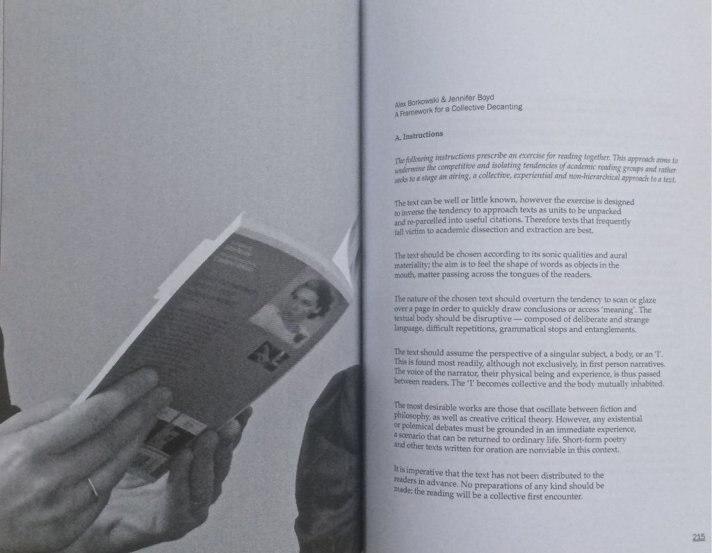 The following instructions prescribe an exercise for reading together. This approach aims to undermine the competitive and isolating tendencies of academic reading groups and rather seeks to a stage an airing, a collective, experiential and non-hierarchical approach to a text.